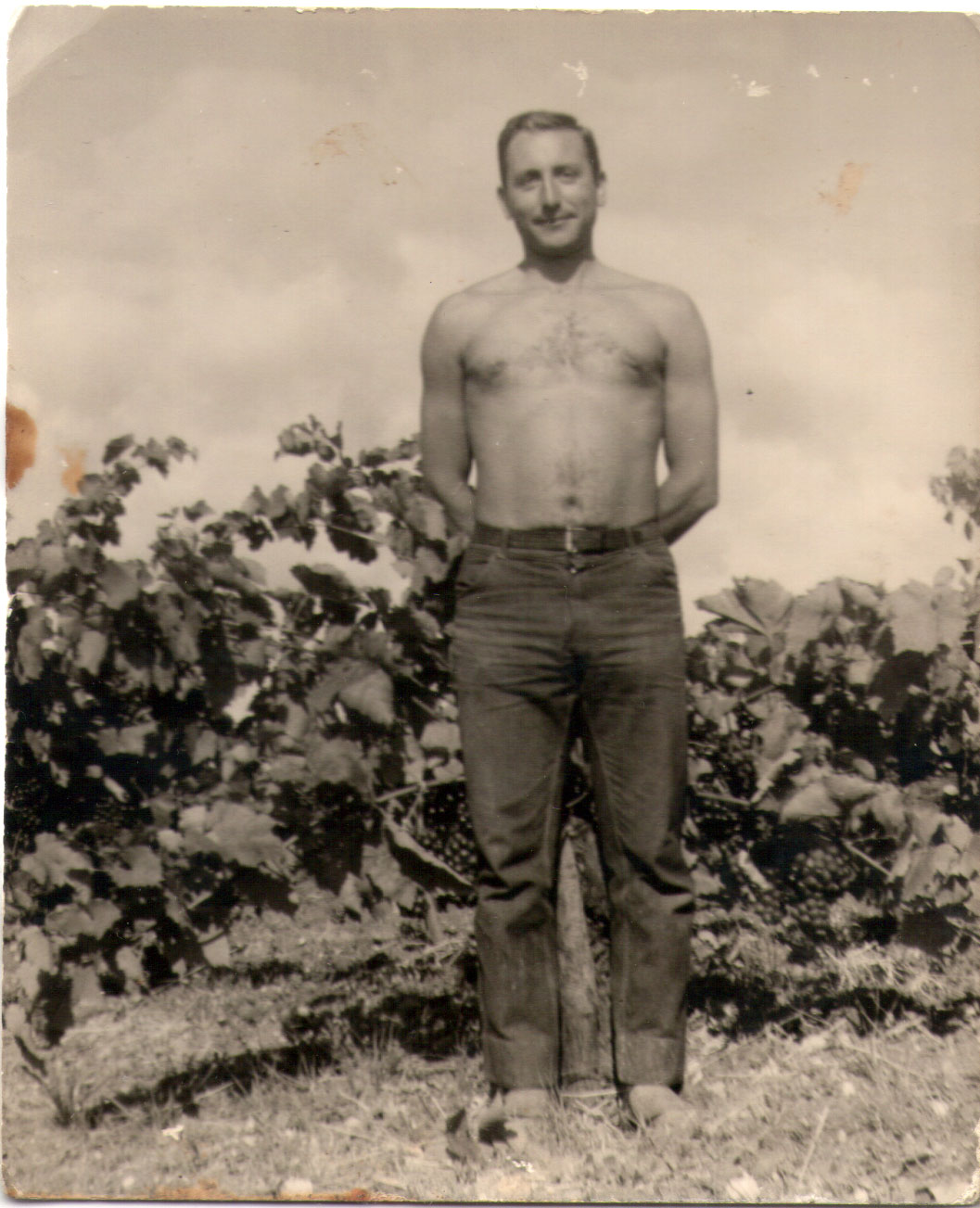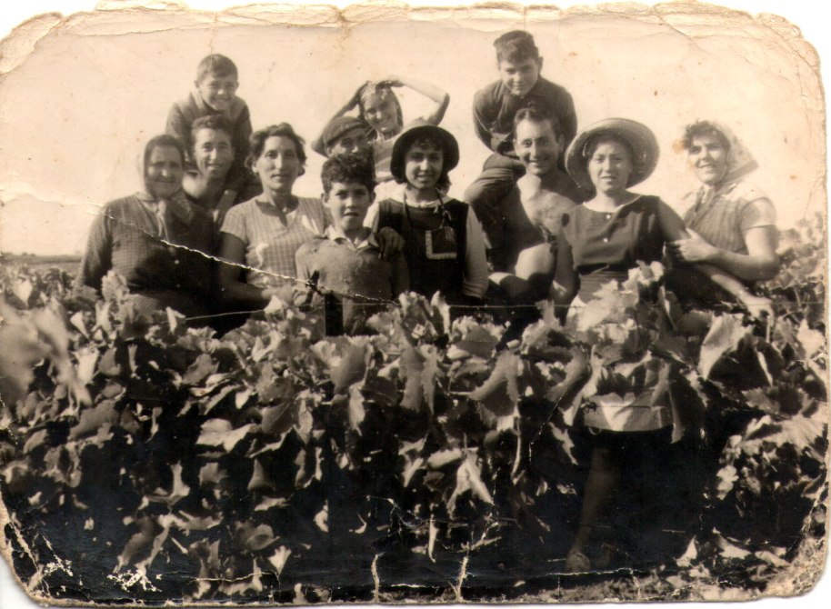 21. Una segona imatge de grup de la verema a França, amb persones de diferents edats, de majors a xiquetes i xiquets. El primer xic per l’esquerra és Juanito Nela, a la vora Carmen del Forn i darrere potser siga José el Tanque, que també anava amb ells. La xica jove del mig anava amb la seua família de Granada, i van fer molta amistat.