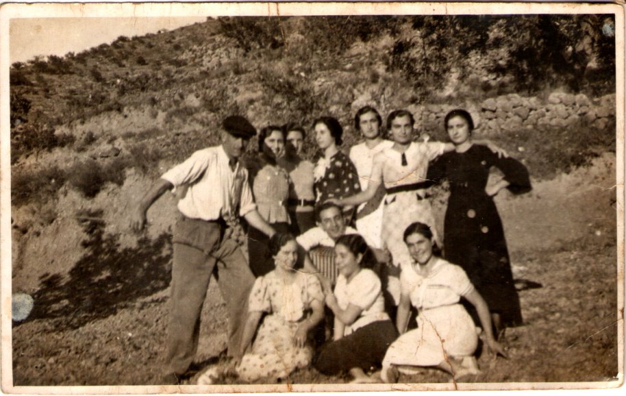22. Un parell d’homes, un d’ells amb un acordió, l’altre amb una vareta, entre nou xiques joves, tots ells vestits i pentinats a la manera dels anys 30. Estan en una zona aterrassada, d’alts tarussos; al secanet de dalt pareix haver-hi una garrofera. Al darrere de la foto veiem un encuny on es llig amb dificultat el nom de l’autor: “Casa MANERO. B7582. VALENCIA”, un fotògraf que va estar molt actiu en els anys 20 i 30 del segle passat.