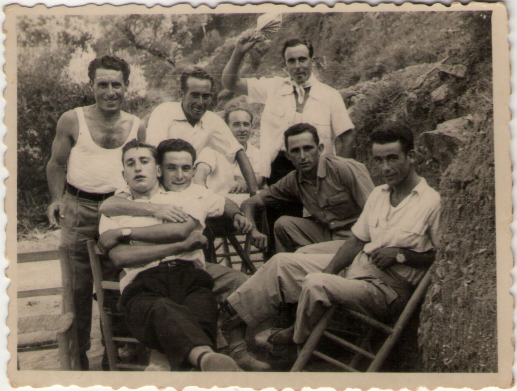 23. Alonso, assegut davant a l’esquerra, amb set amics, entre els que reconeixem, d’esquerra a dreta i de dalt a baix, a Juanito Càrpio, José Catur, un xic d’Eslida i Pasqual de Mançana, i baix, Alonso, Vicente Bolla, José Manyano (o Cagarnera) i Pasqualet de la Font. Estan vora un tarús, potser en el pati d’algú, contra la muntanya. Alonso pensa que estaven en la boda de Sunción amb Floreta en Eslida; òbviament van mudats, però Pasqualet de la Font porta espardenyes de careta.