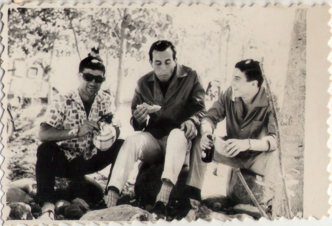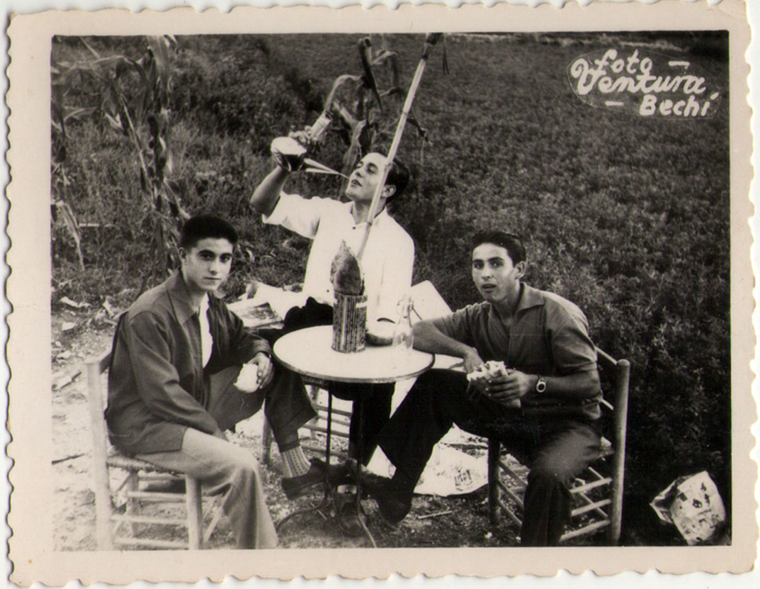 24. Tres joves menjant i bevent vora un camp (d’alfals?). El que beu del barral és Juan, germà menut d’Alonso, que va estudiar i ja treballava a València. El de l’esquerra era un amic seu que no coneixem, i el de la dreta pareix José Luis de Donísia. Com es veu, és Foto Ventura, Bechí, i la data és de setembre de 1958.