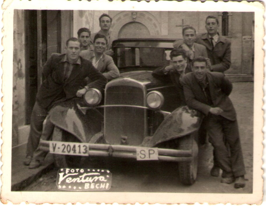 25. Els tres de darrere pareixen Ramón de Tata, Juanito Gorra i José les Piterques; els de davant podrien ser Juanito Nela, José Robín i el propi Alonso. Van en la caixa d’un camió amb què potser van pujar fins a l’Ermita (darrere es veuen les potes d’una cadira). El segell de l’autor: FOTO PONS. Bodas, bautizos y comuniones. Reportages en general. Castellón”.