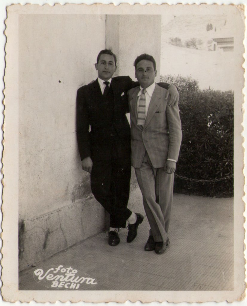 27. Alonso i Bagán. Pareix que estiguen al cantó del llavador, darrere estaria la Creu dels Caiguts, rodada de cadena. Al fondo es veu la Costera i els xiprers de la punta de l’esquerra. Foto Ventura, diumenge 5 d’abril de 1959.