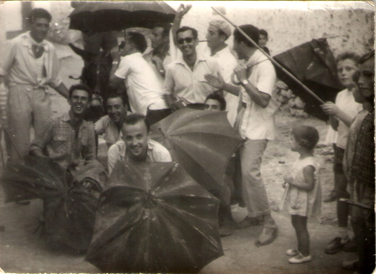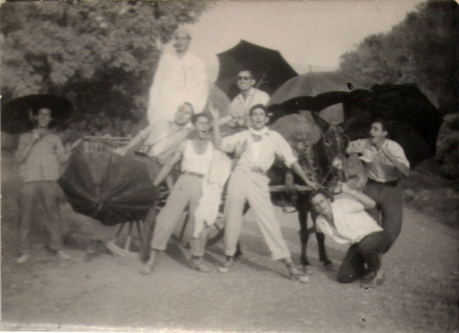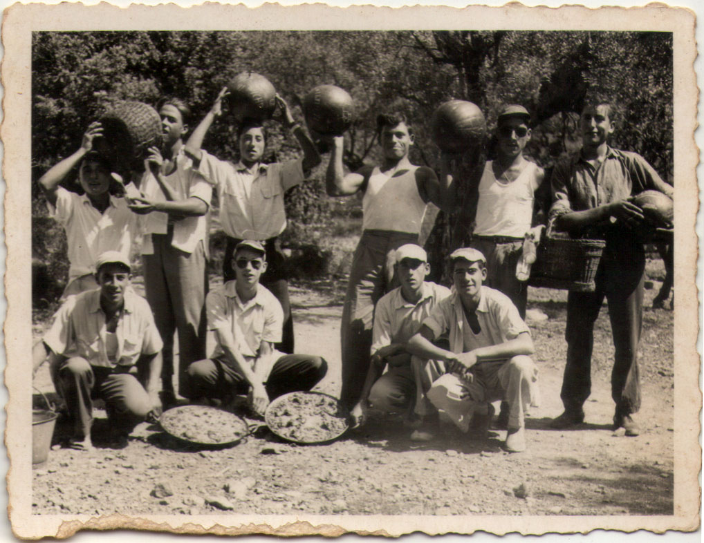 28. Deu joves de festa per l’Ermita, amb paelles i melons d’Alger. En la direcció habitual, un desconegut, Juanito Floreta (bevent d’una garrafa), Juanito Nela, Carlitos, Enrique Càrpio i Alonso. Davant, un desconegut (Fraïsco Veo?), Ramon de Tata (l’home de Clàudia),Valera i José de les Pitarques. Alonso ho recorda com una festa molt bonica. Els melons estaven escrits, possiblement per a que no els canviara algú si estaven refrescant-se a la font. El cuiner, l’escurador de paelles i encarregat en general solia ser Alonso.