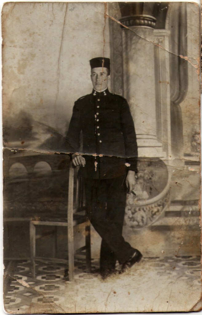 2. Una fotografia d’estudi d’un soldat, feta en Madrid en el primer quart del segle XX. Recolza una mà sobre una cadira i en l’altra du el típic puro que s’utilitzava per a que les mans estigueren ocupades i la posa fóra més natural. Darrere, l’habitual teló pintat amb un interior luxós i un paisatge. Està impresa sobre paper rígid i té imprès darrere el format de targeta postal. Alonso suposa que es tracta de son pare en la mili.
