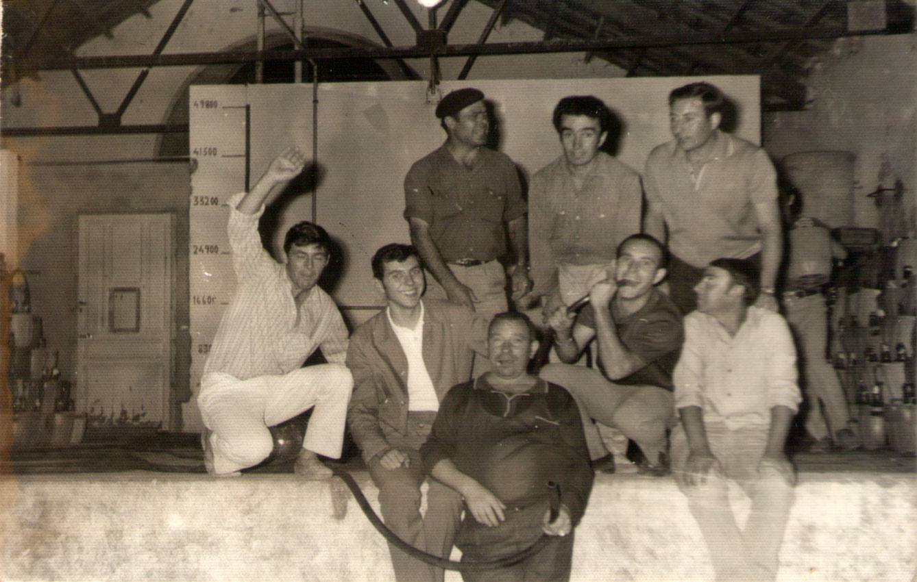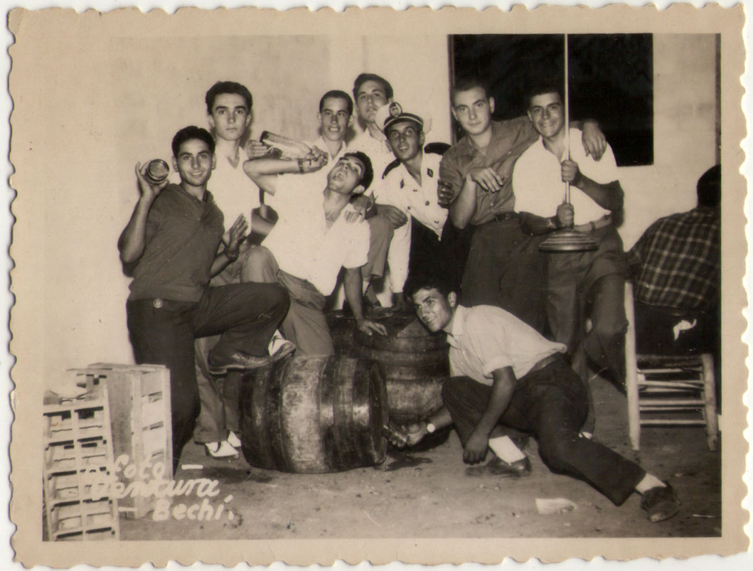 30. Només reconeixem clarament a Pepe Cala (segon per l’esquerra), poc abans de convertir-se en el fotògraf del poble, i a Alonso, darrere de tots. No sabem on estan, amb totes les caixes i tonells. Ventura, divendres 29 d’agost de 1958, suposem que festes de Sant Joan.