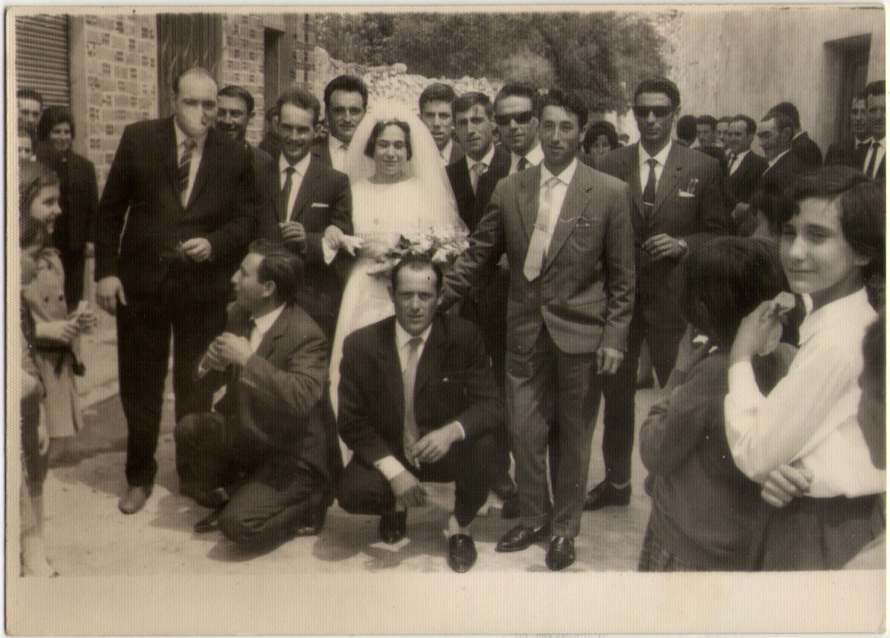 31. Boda de José Robín i Amparito Tata. A l’esquerra Paco Músic, darrere dels contraents Juanito Gorra, a l’esquerra Enrique Càrpio i Juanito Floreta. Davant tenen a Alonso, Juanito Naves i Juanito Nela. La xiqueta de la dreta és Maria Teresa l’Aguatzil. Pareixen estar a la vora de l’antiga Hermandad, actual carrer Santa Cristina vist des de la Carretera. Potser anaven des de l’església fins a l’Almàssera, on se solien fer els banquets.