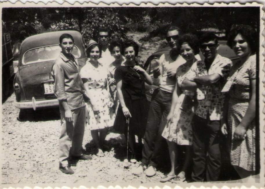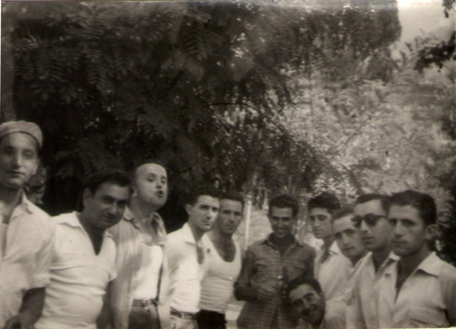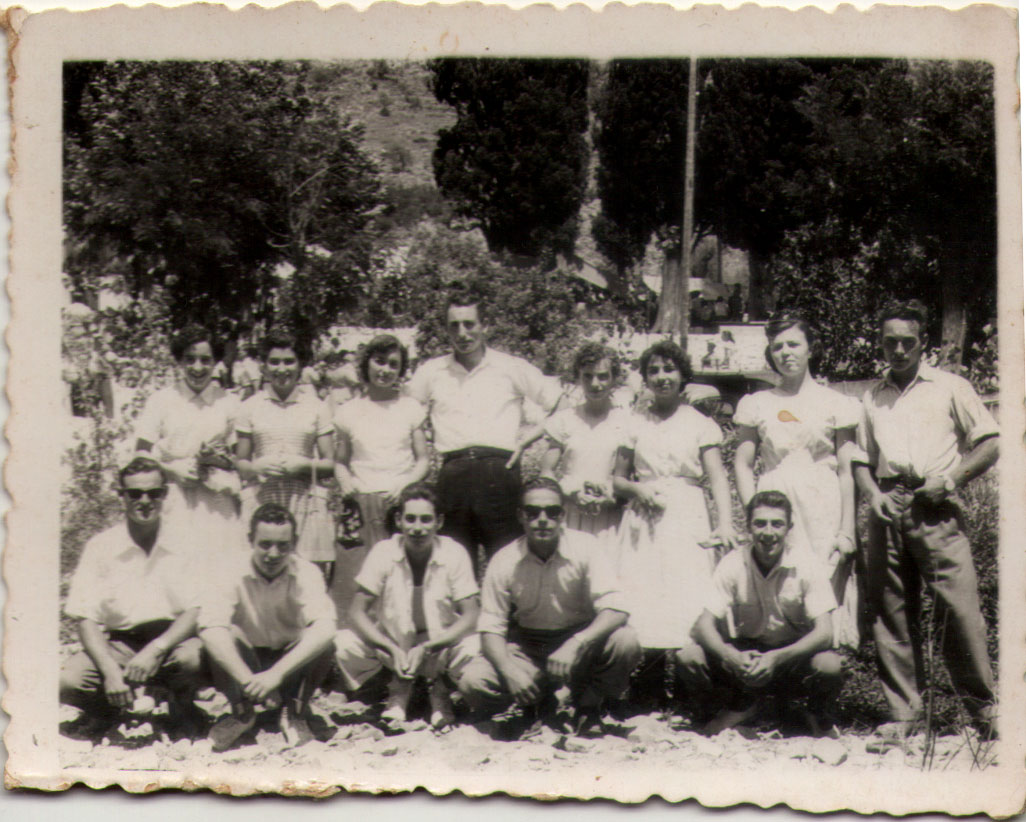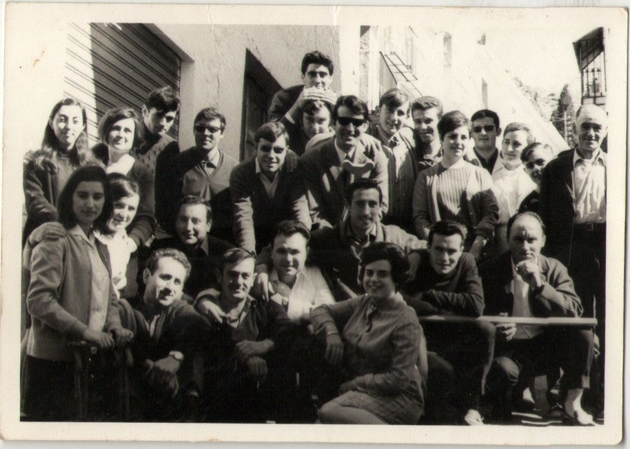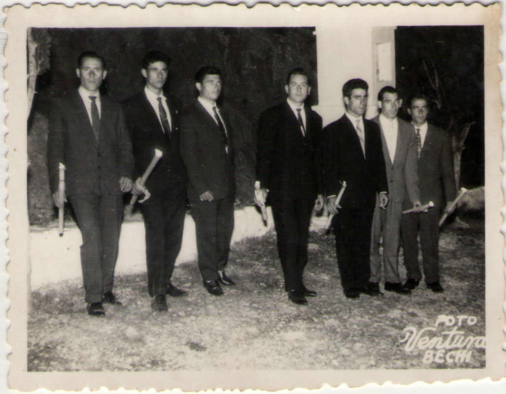 49. Esta foto es va fer el mateix anys que Alonso va vindre de la mili: 17 mesos sense eixir del desert, en Al-Aaiun, el Sàhara espanyol. La gorreta li la va canviar per la seua a un militar francès. Era la festa de Sant Roc, el dijous 16 d’agost de 1962, i va quedar amb els Pelegrins, que diu que el van acollir molt bé i amb qui seguiria ajuntant-se en avant. Estan a l’Ermita, i són Alonso, Miguel Sancho, José Chacola, José Casanova, Palanques, Ramoneta, Juanito Choto, baix José Saca, Caña, l’Ordenari i el Maño. Alonso conta que els Pelegrins eren un grup molt obert que acollia a tothom i amb qui anava molt a gust.