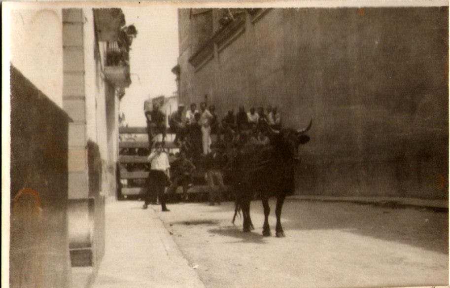 38. Com a màxima expressió de la part profana de les festes tenim una foto del bou del Cristo (ens ho imaginem per la situació de la barrera), no sabem de quin any. El carrer major està desconegut, amb les cases d’estil tradicional i encara amb pedres roderes a les brancades. El fotògraf es va arriscar per fer esta foto.