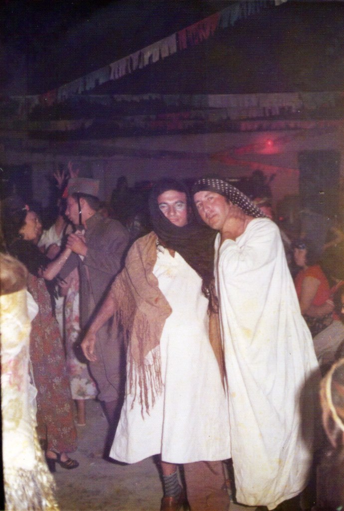 40. Vicente el Pelat i Alonso en un ball de disfresses d’alguna festa d’estiu. Ens conta Alonso que pot ser a l’espai que hi havia darrere del Bar Herrero, on es feien alguns balls. Al darrere, una tira de xifres acabades en 1987 (201121987).