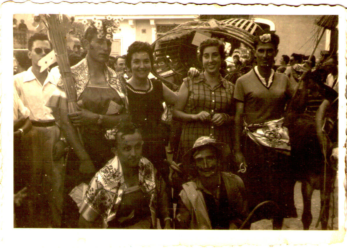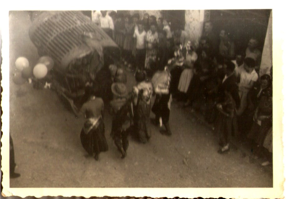 42. La mateixa festa, amb Alonso vestit de dona i amb un pal amb volaorets, dos xiques de Massanassa que venien molt per Artana, José Ramoneta i José Chacola vestits de gitana i Vicente Gilet amb barret i falsos bigotis. Pareix que estiguen a la plaça Major.
