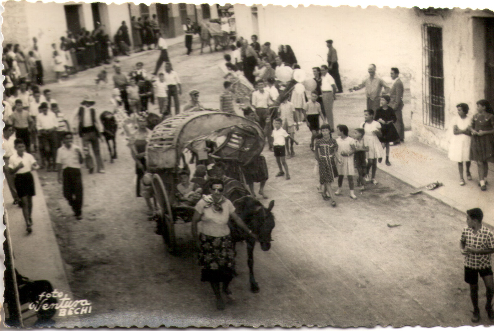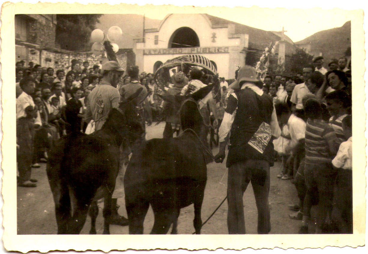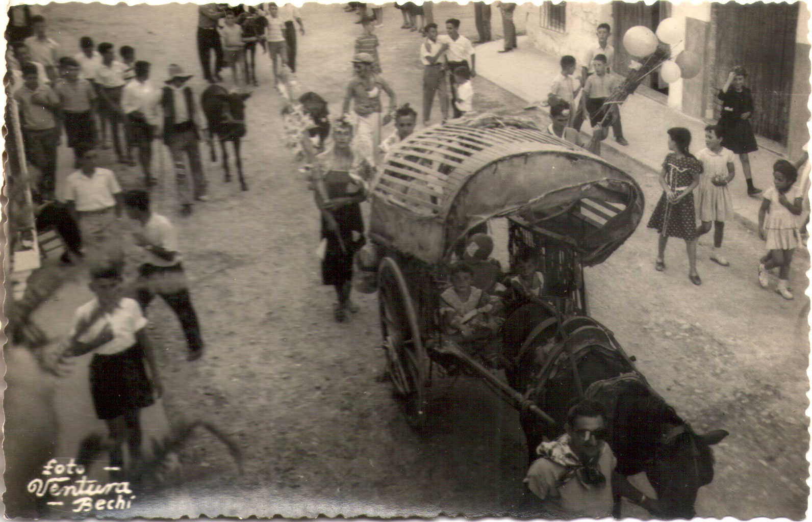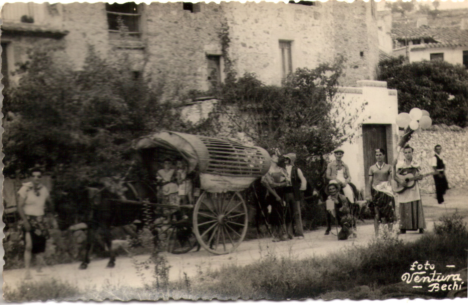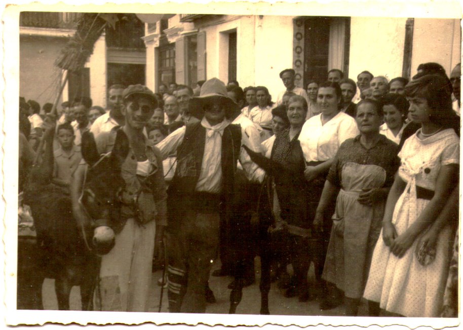 41. Vicente Pallarés Gilet i Alonso, disfressats respectivament de gitano i de gitana, de jugarota amb un pobre burret. Com ja es va veure en la col·lecció de fotos de José Silvestre Villalba, ‘el Maño’, es tracta de la Penya els Pelegrins en una “cabalgata” en les festes d’agost (Sant Joan) de 1959, disfressats de gitanos, amb burros, un carret, etc. Van tindre la idea eixe mateix dia, a l’eixir de missa major li van demanar permís a l’alcalde, Joaquín Caranyo, li ho van explicar i li van dir que traurien un carret que Alonso tenia retirat. Van tindre molt d’èxit però només van guanyar el segon premi: el primer va ser per a les Regines, que van eixir fent espartí sobre un camió molt ornamentat. Ventura, diumenge 30 d’agost de 1959.