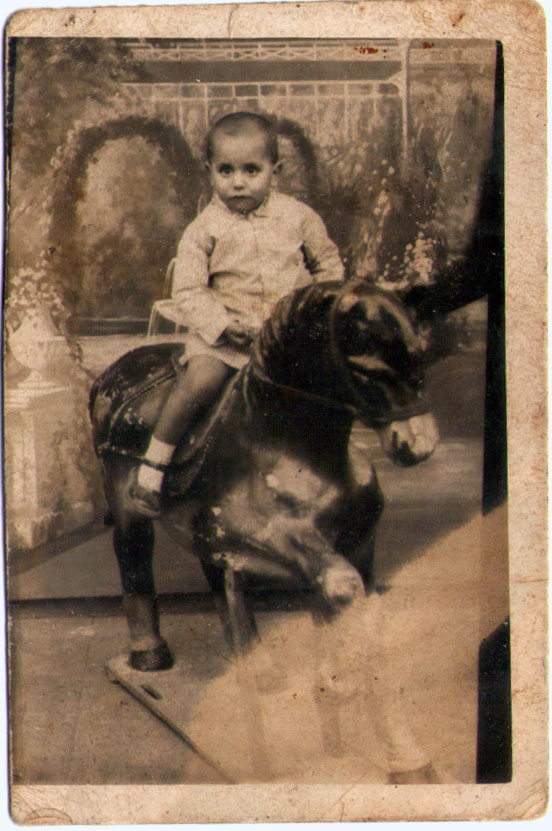 4. Un xiquet (pareix el propi Alonso) posa sobre un cavallet davant d’un teló de fotògraf que representa un jardí exuberant.