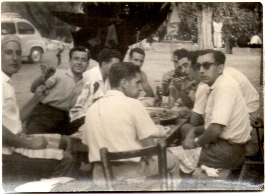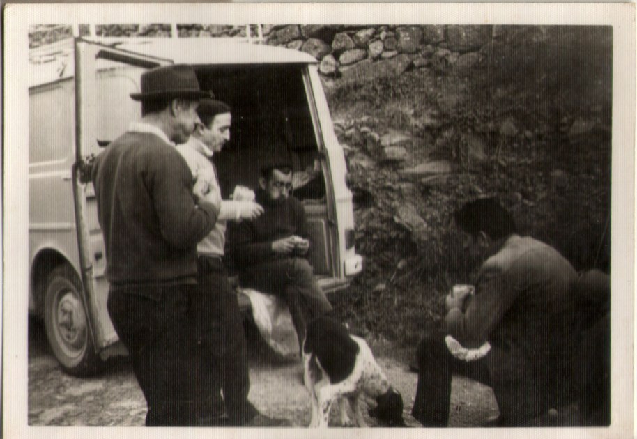 56. Alonso ens parla d’una celebrada partida de caça a Daimiel (Ciudad Real) amb els Pelegrins, a parar visquet. Potser açò siga part del grup, esmorzant mentre els altres “pegaven mirà”: pareixen ser Juanito Ramoneta, Vicente Caña, Juanito l’Ordenari i Juanito Choto. Fixeu-vos quina abundància de “Juans”, el nom més clamorosament abundant en aquell moment.