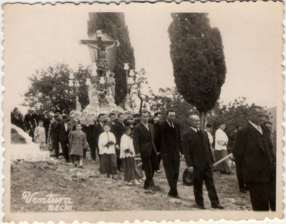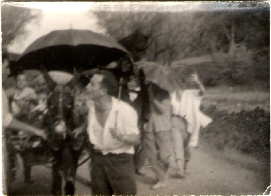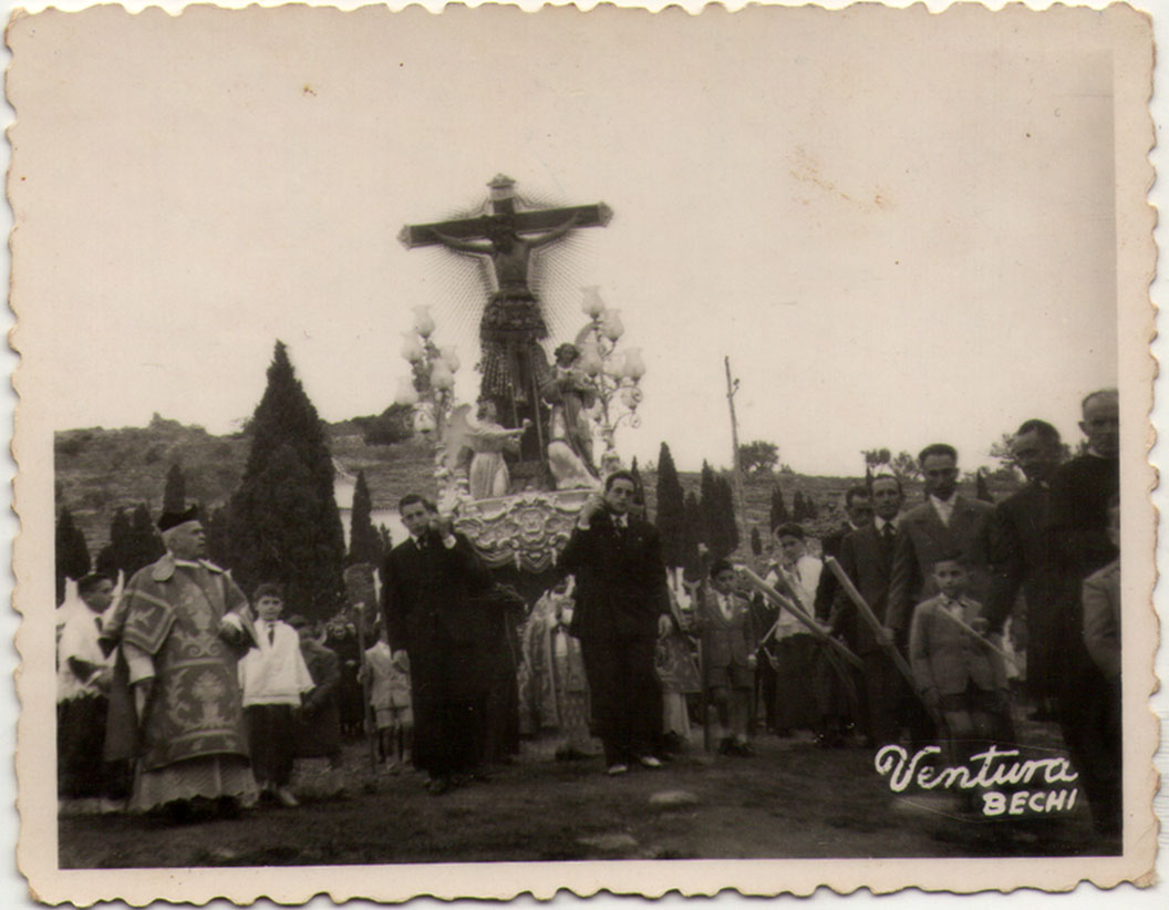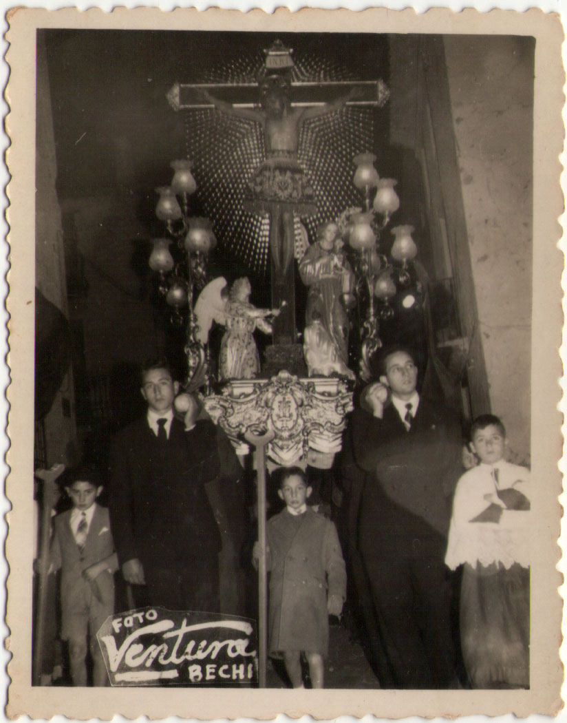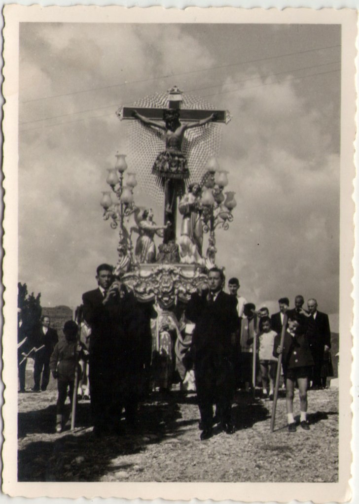 Però el propietari de les fotos ens conta una història que desconeixíem: aquell any va ploure molt, el dia del Cristo va parar i van baixar la peanya, però eixa vesprada hi havia tants tolls i tant de fang al carrer Baix (que, com tots, era de terra) que no el van traure. El diumenge següent van fer la volta de la processó i, sense entrar en l’església, van pujar al Cristo al Calvari, tot d’una tirada. Una de les festes del Cristo més accidentada de la seua història, i més pesada per als seus majorals.