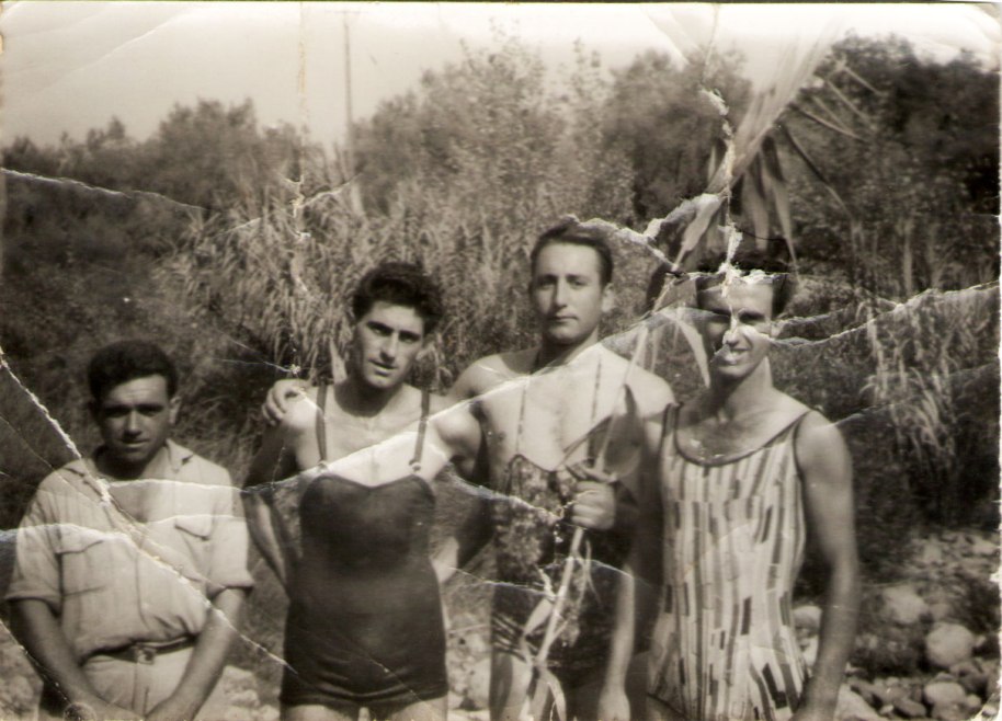 54. José Baleso, que aleshores era regador, amb Juanito Choto, Alonso i Juanito Ramoneta amb banyador de xica.