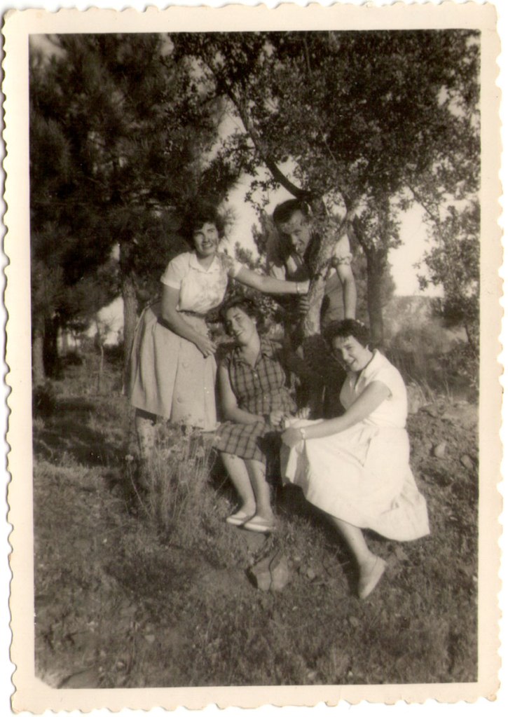 55. José Chacola, la seua cosina Pilarín, que vivia a Castelló i les dos amigues de Massanassa que hem vist abans, al voltant d’un jove alcornoc.