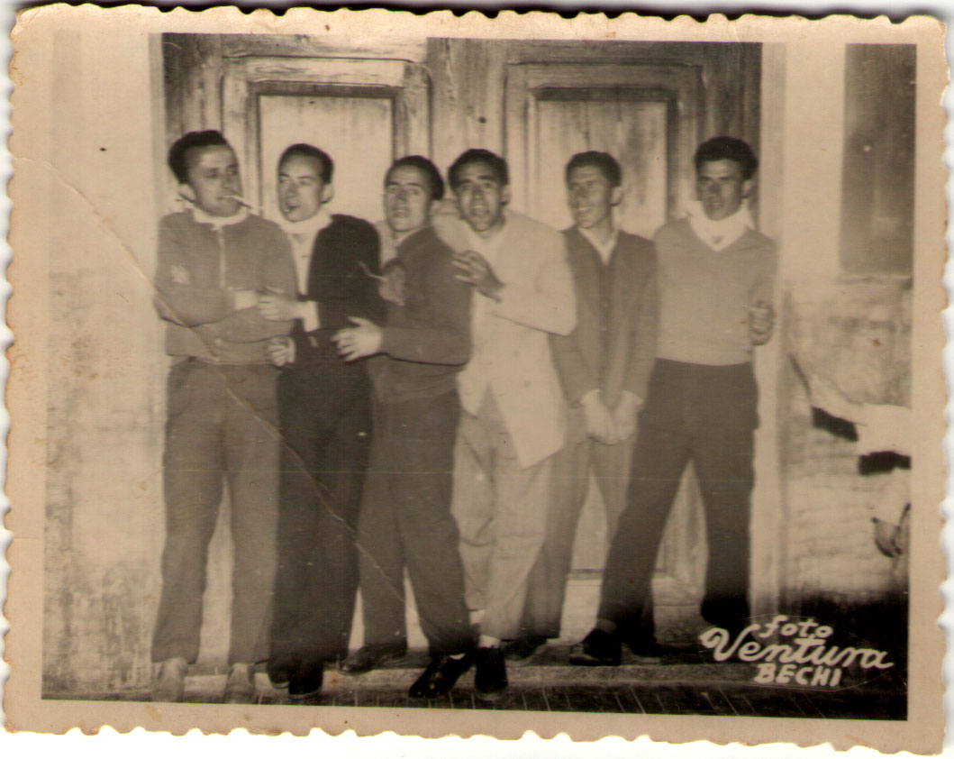 57. José Nela (Chacola), Vicente Gilet, Caña, José Saca, un desconegut i Juanito Ramoneta. Està escrita darrere: “Cuando llegue esta en tus manos, encontraras a 6 tios borrachos y no es de agua de la Fuente sinó de ese tinto que tu tan conoces, de Roya, pero con Roya y sin Roya te la dedicamos como Buenos amigos, y si tienes un buen tinto puedes agregarte con ella, y haces un numero mas. Un grande beso dels pelegrins que no te olbidan nunca. [signatura il·legible]”. Foto Ventura (Betxí), 6 de març de 1959.