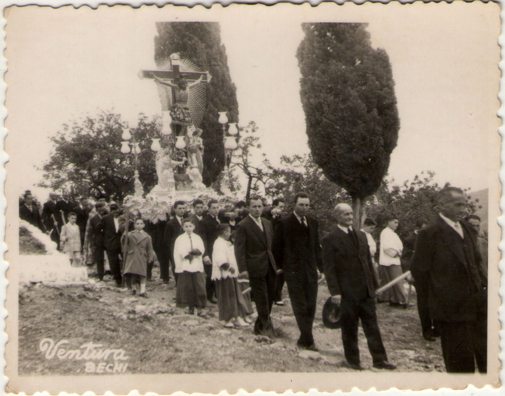 58. Comencem una secció de fotografies de processons, algunes d’elles ja desaparegudes. Esta primera ja s’havia vist, els joves majorals són els de la penya els Pelegrins, davant Blai de Benarda, Juanjosé Tata, el tio Granello i José Maria Barros. Baixada del Cristo del Calvari. Foto Ventura, diumenge 13 d’abril de 1958