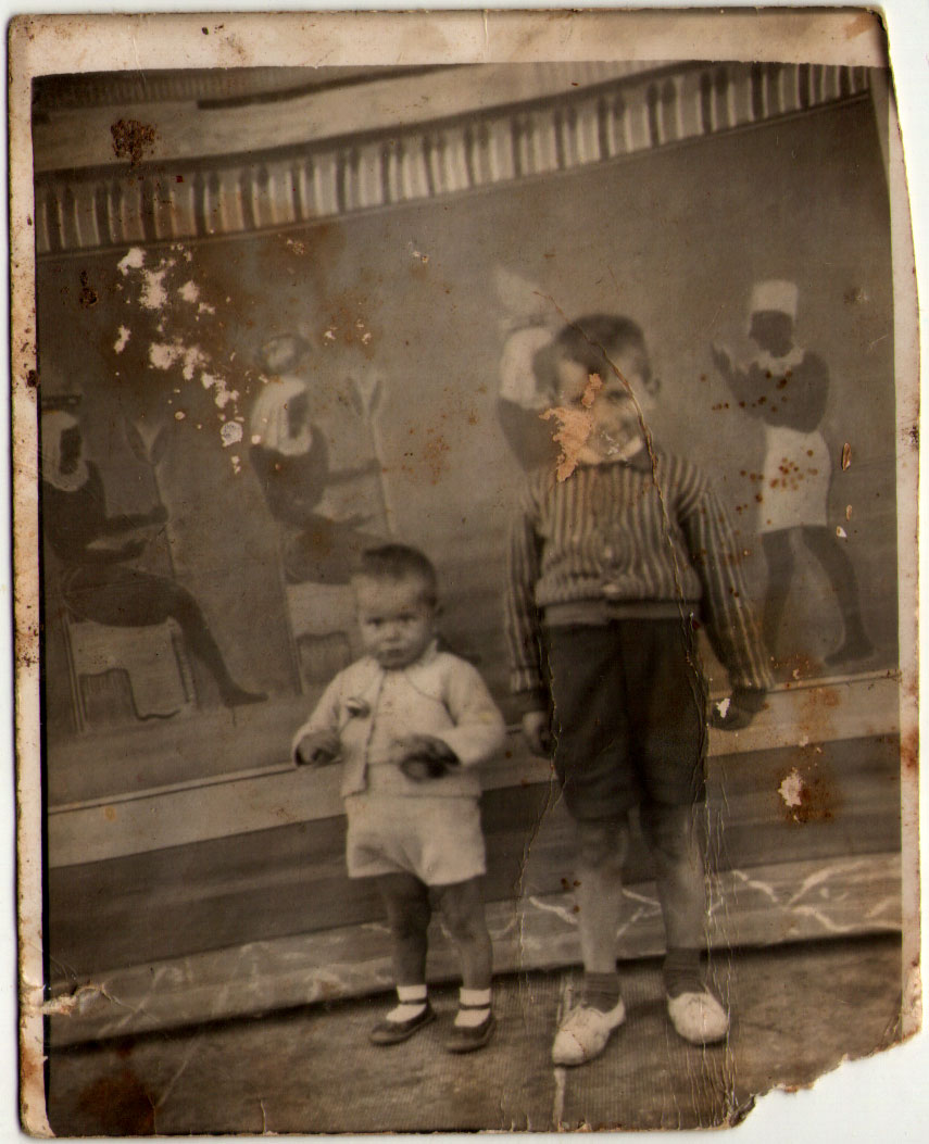 5. Dos xiquets davant d’un teló de fotògraf amb motius egipcis. Els fotògrafs venien a distintes festivitats i posaven els seus telons on venia bé: a l’Ermita, a la plaça de l’Ajuntament… Si havien de fer nit en Artana, els fotògrafs es quedaven a la “posà” de Marí Blanco, la mare de Solet, que estava on ara té la fusteria Joaquín d’Olegário. La posada era més modesta que la Fonda.