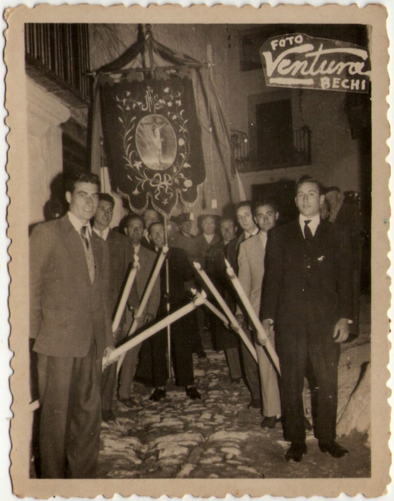 59. Una altra instantània de la mateixa Baixada; el capellà és mossèn Joan, els majorals Alonso i Vicente Cabrero. Amb ciris, Joaquín de Blai, Vicentico Mañá, Pasqualet de la Font i, potser, José Germán. Foto Ventura, 13 d’abril de 1958