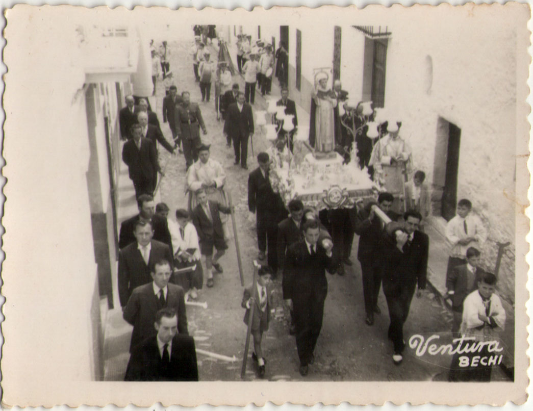63. La mateixa processó, pel carrer Baix. El retor de l’esquerra és mossèn José Panchut. Darrere el sargent de la Guàrdia Civil, l’alcalde Joaquín Caranyo. A la fila de l’esquerra, de davant a darrere, un desconegut, Joaquín de Blai, Blai de Benarda i Juan José Tata.