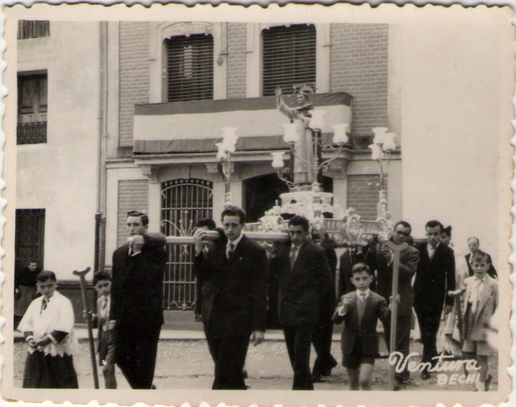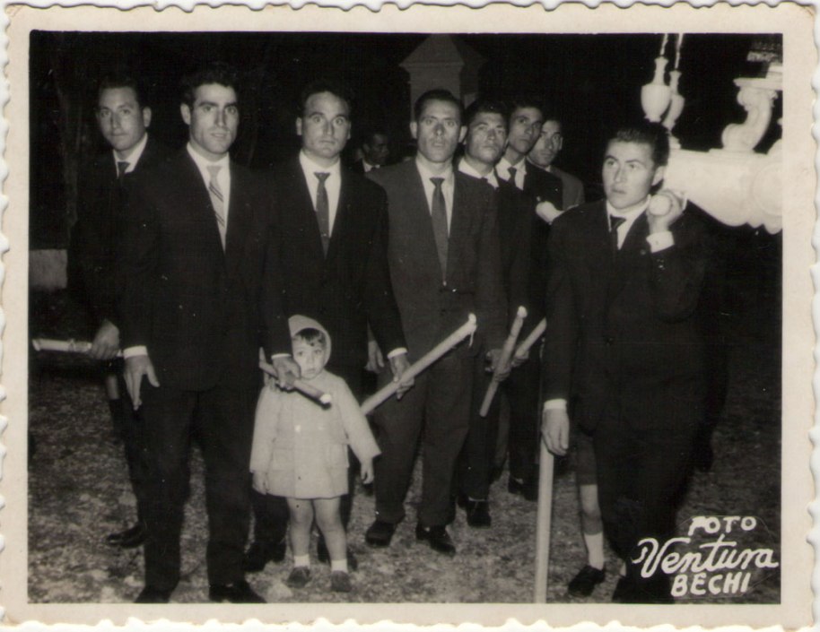66. Quatre anys després, després de tornar de la mili, el trobem en la Pujada del Cristo al Calvari. Coneixem a Alonso, a l’esquerra, hi ha dos desconeguts i el següent és Juanito Naves. El que porta la peanya és un dels germans Solo. Foto Ventura, amb la data, possiblement errada, del dimarts 1 de maig de 1962. És més provable que es celebrara el 30 d’abril, dilluns.