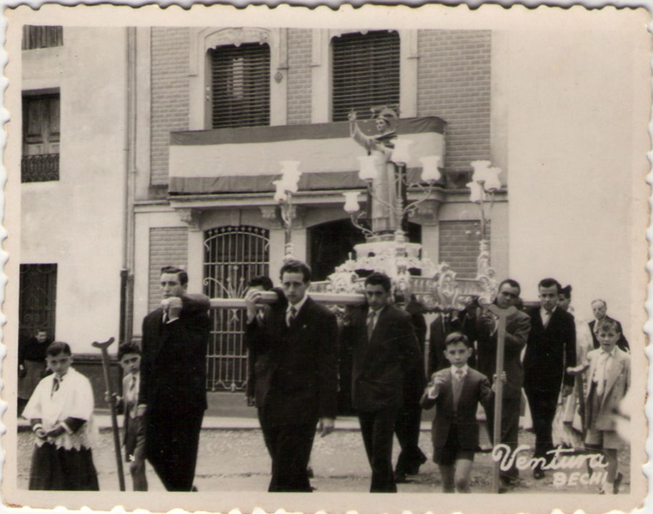 72. La peanya del Cor de Jesús passant pel carrer Baix creuant al carrer Colom. Estudio Fotográfico J. Catalán. Artana. Diumenge 26 de juny de 1963.