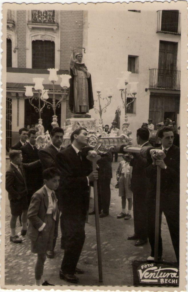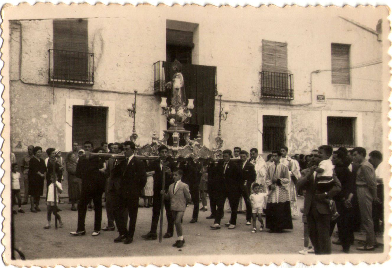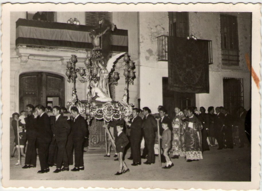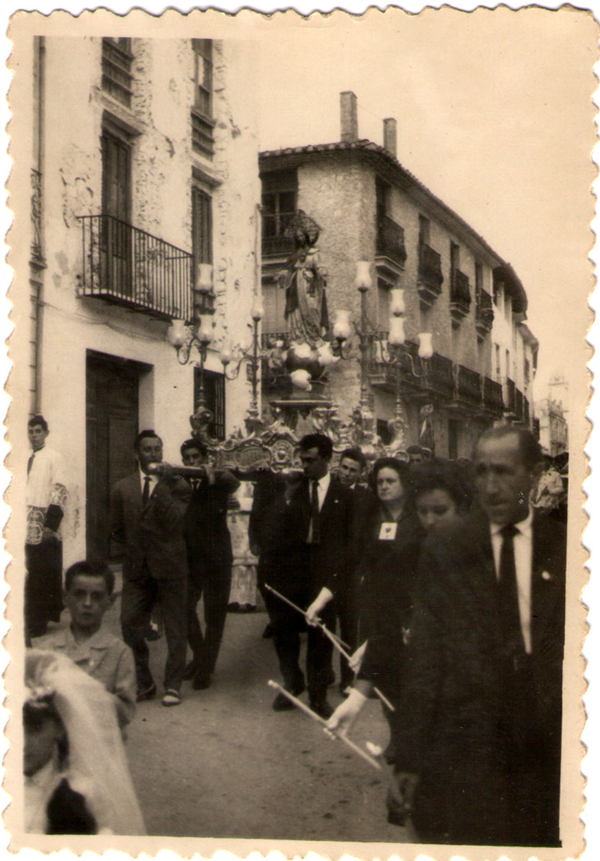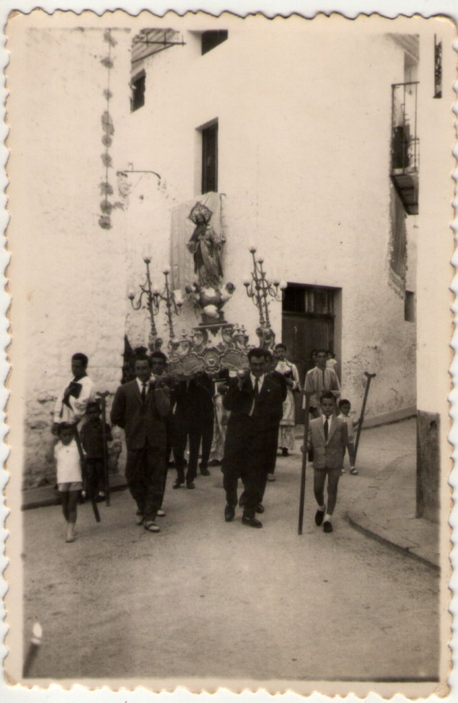 62. Eixint de l’església pel carrer Major, es tracta de la desapareguda processó de Sant Vicent, que es feia el seu dia després de missa. El dilluns de Sant Vicent era un dia molt ple d’actes religiosos: processó dels Combregars, missa solemne amb predicador, processó de Sant Vicent, i de vesprada processó de Pujada al Calvari. Els majorals, els mateixos que a la peanya del Cristo; el retor és mossèn José Tomeu. A l’esquerra el rètol de Teléfonos que estava a casa José Maria Cabañes Ibáñez, el Pesaor, hui molt modificada. Amb data errada del 13 d’abril de 1958, perquè el dia de Sant Vicent va ser el dia 14.