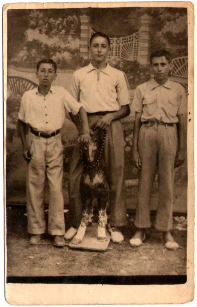 8. Fira Santa Cristina, retratant-se tres amiguets davant d’un teló de fotògraf que representa un jardí florit, amb un cavallet dels que posaven per retratar xiquetes i xiquets. Són Juanito Nela, Alonso i Juanito Valero. Fixeu-vos les espardenyetes que porten.