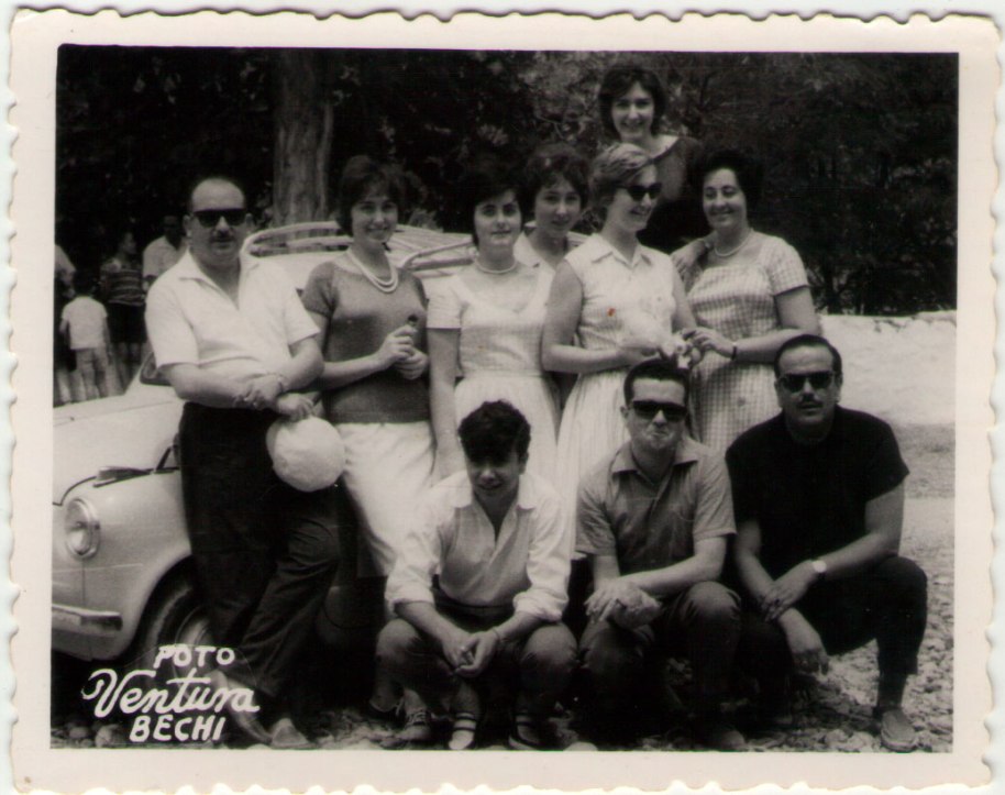 26- De nou a Fira a l’ermita, recolzats sobre un flamant Seat 600. Les xiques són, començant per la dreta: Pilar “la Catalana” i la seua germana (la segona per l’esquerra), dalt de totes Pilarín de Pla, amb ulleres negres Angelines (cunyada de Joaquín Caranyo), i les altres dos xiques són Pilar i Emília Caballero. El que està ajupit vestit de negre i amb ulleres es “Paco el Madrilenyo”. “Foto Ventura”, dilluns 24 de juliol de 1961 (festivitat de Santa Cristina).