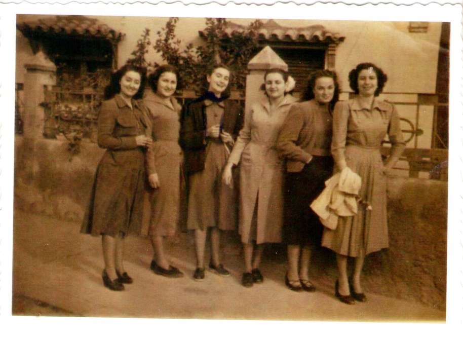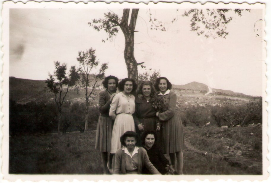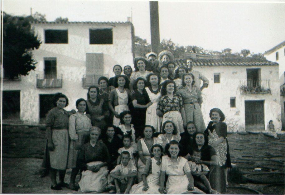 16- Una colleta de xiques del poble contra un alcornoc i amb el poble al fons. Són Maruja (dona de Benjamín de Cagarnera), Carmen de Vedrí, Lolín (filla de don Valeriano, el secretari), Rosario Bollo i, davant, Trinidad de Royo i Marí Primitiva. Hi ha molt poca brossa i els arbres estan molt esquilats, possiblement perquè actuaven els gavellers.
