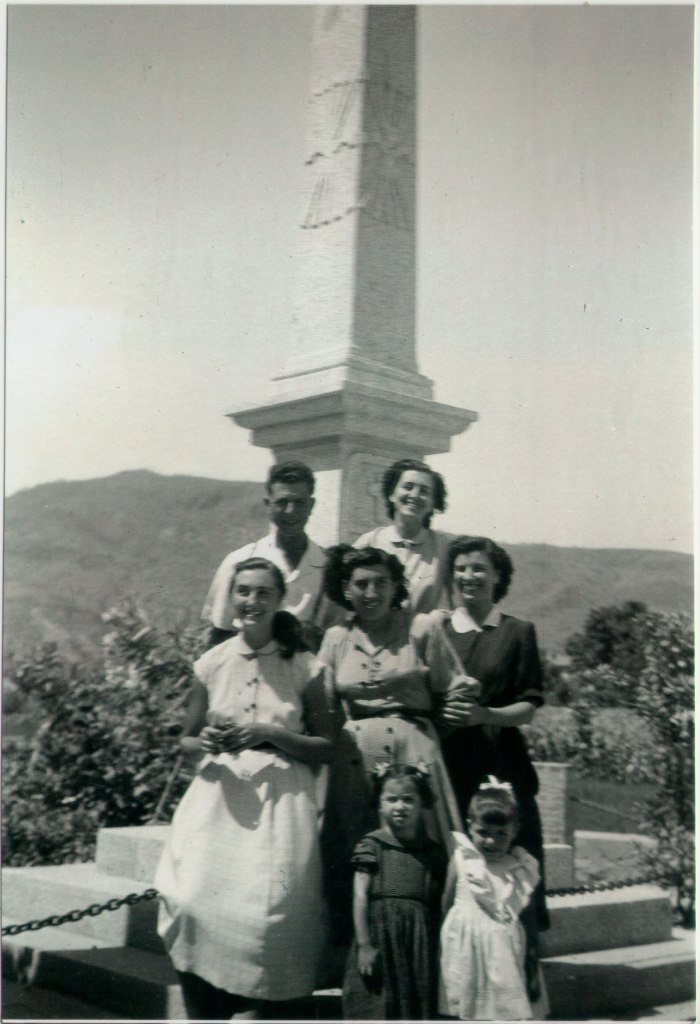 22- Típica foto davant de la creu dels caiguts, on ara està l’ambulatori. Són, darrere, Vicente el Cartero i Teresa i davant Angelines, Carmen de Vedrí i Doloretes de Manzana. No sabem qui són les xiquetes. Darrere de la creu, horts en producció.
