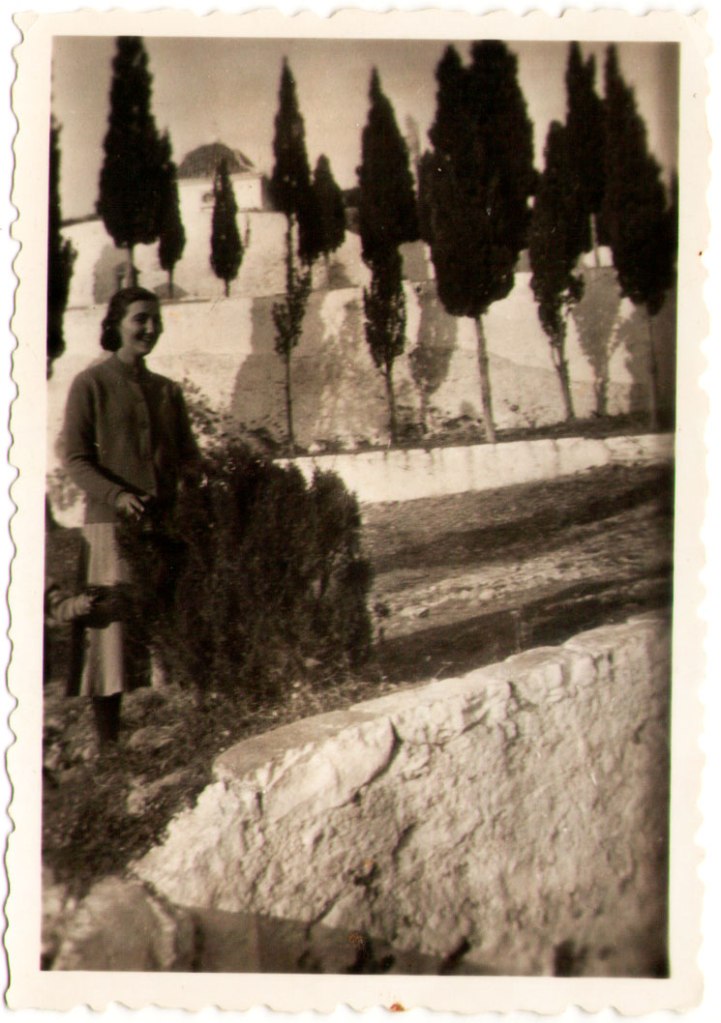 19- Una jove en el calvari d’Artana, en aquell moment molt més auster que ara. És Angelines, germana de Paquita i nascuda a Rosell. La foto està feta amb una clara consciència de l’aspecte monumental i paisatgístic del Calvari.