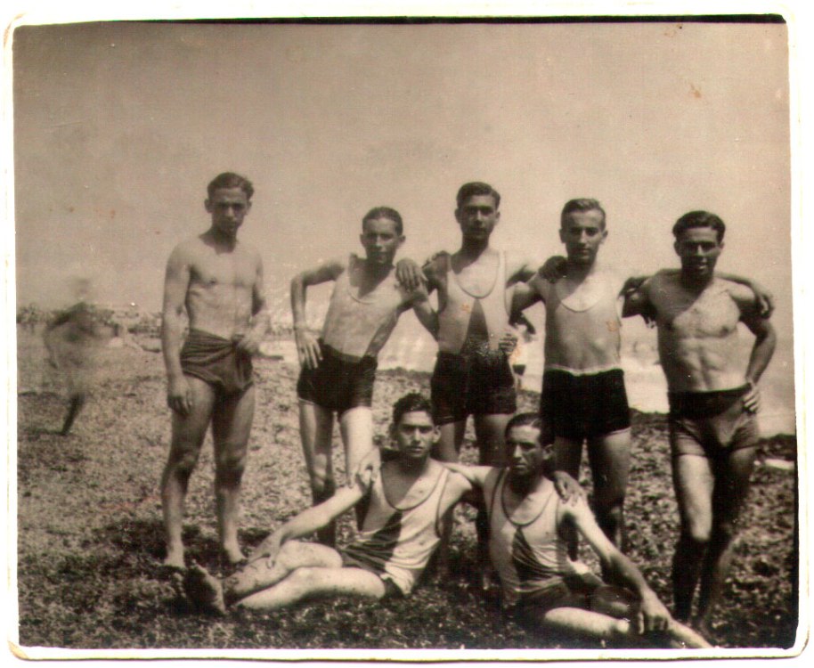 1- Una colla de joves banyistes abans de la Guerra. Pertanyien a la “Penya Imperio”, potser per això la majoria porten una samarreta “d’imperio”, és a dir, de tirants, sense mànegues. En el grup reconeixem al tio Chato, a José Sol, al tio Herbetes i a Joaquín Caranyo (assegut a l’esquerra). A la platja no es veu molta gent, no pareix que fóra un lloc tan popular o almenys tan masiu com ara.