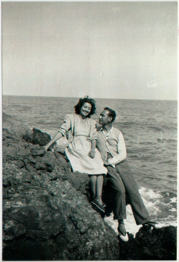 23- Fins a no fa tant de temps, anar a la platja no era una activitat massiva i habitual com ara, començant per la distància que separa el poble de la mar. Amb els cotxes, l’accés a les platges i a la mar es va democratitzar. En esta ocasió tenim una escena romàntica de parella en la mar quan encara no estava normalitzat com ara. Són especialment cridaneres les espardenyetes de careta o en general lligades a la garreta. Són Joaquín Caranyo i la seua dona, Paquita.