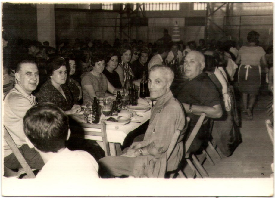 42- Imatge d’una boda en Artana. Estan al principi del dinar, menjant encara el plat de calent. Aleshores les bodes les feien a l’edifici de l’Almàssera, per darrere dels pilars anaven les vagonetes amb la pinyolada. S’hi veuen molts caixons de beguda i dones afaenades amb els tradicionals davantals blancs dels banquets de gala. Quant als retratats, d’esquerra a dreta reconeixem a Filiberto, Francisco Caranyo, José Juan de Coloma, Jesús de Fermín (el capellà), a Vicente el Cartero i a José Luis de Chesa amb la cullera a la mà. La xica amb els ulls tancats és Cristina. Beuen cerveses, que aleshores era una cosa elegant.