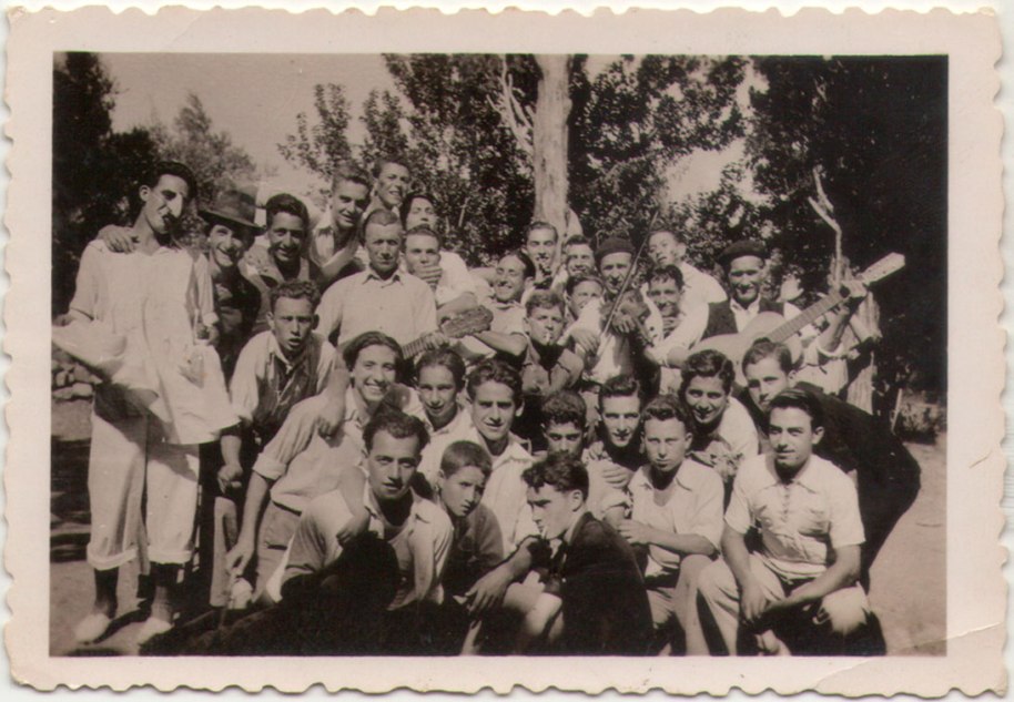 4- Una foto preciosa en què es veuen als joves al voltant de tres músics llegendaris: Benjamín de la Plaça, amb el llaüt, el tio José Martino amb el violí, i al tio Benjamín de Benarda amb la guitarra. José Martino era multinstrumentista, va ser director de la banda d’Artana i més tard de la de la Vall d’Uixó. Tots tres amenitzaven moltes festes populars, de vegades de forma improvisada. Imaginem al grup en l’Ermita. Entre els joves reconeixem per darrere a l’esquerra a Vicente Sol i a Vicente el Cartero, i per baix a la dreta a Salvador Vigueta i a Pere la Roja, tots ells molt jovenets. A destacar el xic del nas postís, que pareix disfressat.