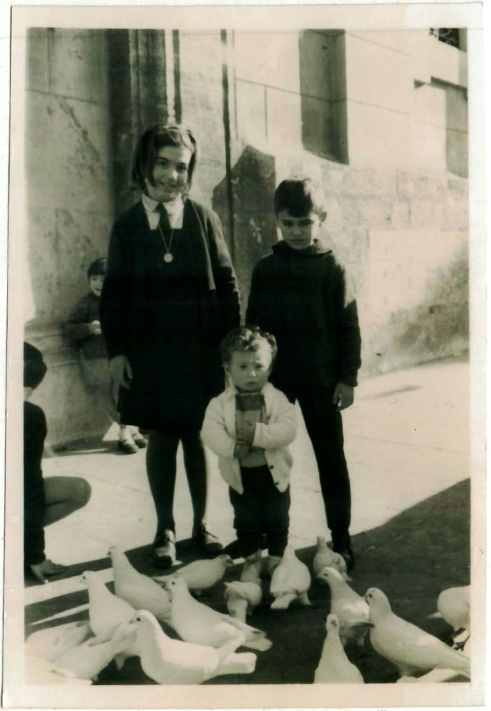 34- Els tres germans, Mari Ángeles, Francesc i Juan Ignacio, posant de nou per a son pare al voltant de 1963. Estan a la plaça de la Verge de València, davant de la Basílica de la Mare de Déu dels Desemparats. Mari Ángeles porta l’uniforme del col·legi de les Teresianes.