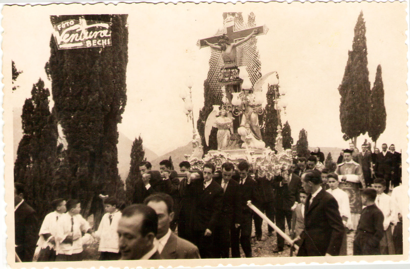 13- No podien faltar les festes religioses: ací veiem com arranca la Baixada del Cristo des de la capella del Calvari l’any 1958; darrere els capellans mossèn José Tomeu i mossèn Ramon i les autoritats, Don Salvador, el sergent de la Guàrdia civil, que era família dels Manzanes, i l’alcalde, Joaquín Vicent Agramunt, “Caranyo” (a qui també deien “José Caranyo” per un tiet). Part dels majorals que porten la peanya pertanyen a la penya “els Pelegrins”, però també altra gent com Joaquín de Blai, Vicente Menuda o José Casanova. A esta banda de les barres creem reconèixer a Vicente l’Amplet, José Nela (Chacola), Juanito Ramoneta, José Garrofa, Vicente Pallarés (Gilet) i un desconegut. Davant, els acòlics xarrant molt animats donen el punt d’alegria i desordre a la solemnitat de la foto. “Foto Ventura”, diumenge 13 d’abril de 1958.