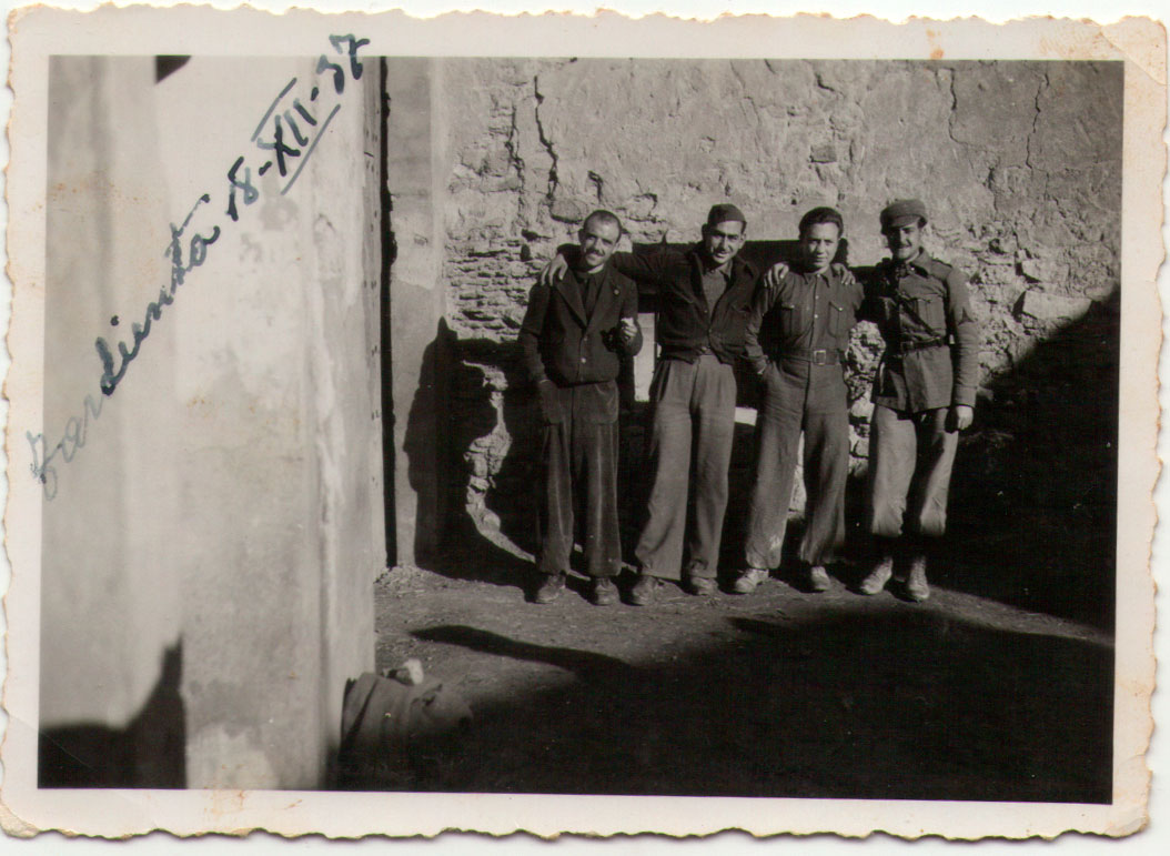 5- Tardienta, dissabte 18 de desembre de 1937, en plena Guerra Civil. Darrere du una inscripció: “A mi madre y hermanos como prueba de cariño JVicent”. Tardienta (Osca) va ser un enclavament estratègic en el front d’Aragó; suposem que Joaquín (segon per l’esquerra) va fer la guerra reclutat pel govern de la República.