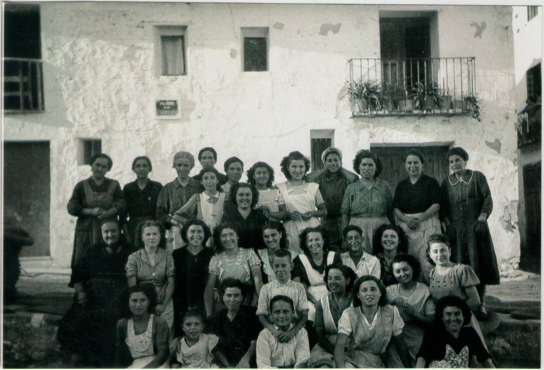 28- De nou la plaça Nova, i aproximadament el mateix grup de dones i xiquets. D’esquerra a dreta, començant per darrere, la mare de Pepe Cala, Marí Tola, Felicidad de Rufo, Marí Gorra, Teresa Meto, Lolita Serra, Lolita Vilavella, Carmen “Caranyo”, la ti Casanova i la ti Sunsión de Pansa. A la fila de baix, Marí Gorra, Doloretes de Pina, Carmen de la Font, Consuelo Vilavella, Trini Satorlina, Adoracioneta de Fuester i Rosita (germana de Miguel). Baix del tot, Isabel de Capellana, Tomàs Piqueras, Consuelo Capelleta i Amparito Pansa. De nou la foto és de Joaquín Vicent, “Caranyo”.