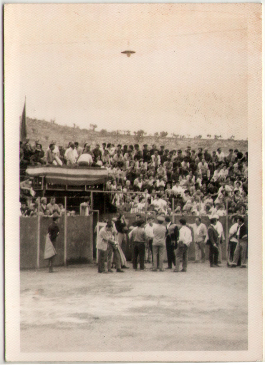 10- La coneguda correguda de bous en plaça portàtil que es va muntar pel camp de futbol el divendres 30 d’agost de 1963, a festes de Sant Joan Baptista. Es pot apreciar la quantitat de gent i, molt curiós, la llumeta que havien penjat per il·luminar el “ruedo”.