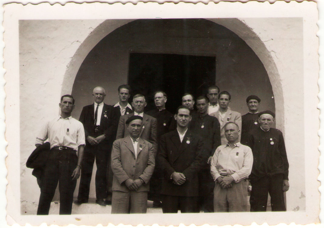 9- De nou una colla de prohoms del poble amb la medalla de la Vetla Nocturna. Amb algunes mancances, veiem al germà de Pura Taletes, a Joan de Benardo, a mossèn Benjamín, a mossèn Juan Pallarés, al Moreno Garrofa, a José Maria Cabañes i al tio Granello [el tio Granello és el que va pagar la peanya del Cristo després de la Guerra; s’ho va disputar amb el tio Eladio, que ja havia donat la fusta per a la creu]. En primera fila veiem a José Meto, a Pasqualet de la Replaceta, a Joaquín Caranyo i a Enrique Calo.
