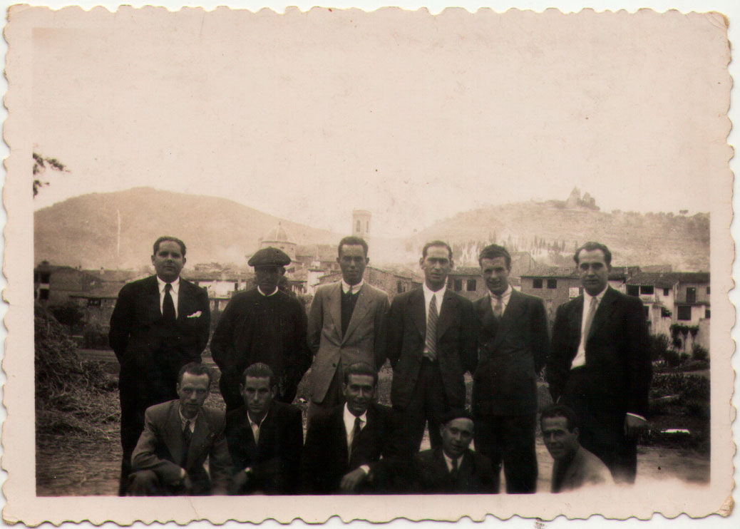 3- Ja coneixíem esta imatge de la segona col·lecció d’Isabel Gallart. Es pot reconèixer, entre altres, situats en mig a José María el Ferrer, Joaquín Caranyo, Nano i Juan de Sol; el de més a la dreta, inconfusible, Pascualet de la Pobila (un home molt graciós del grup de teatre local, que generalment feia de consueta o apuntador); baix, des de l’esquerra, José Catret, Vicente el Cartero, Pascual de Blai i Vicentet de Pla. Provablement estan de festa a l’Ermita, a la dreta es veuen els barrals d’un carro.