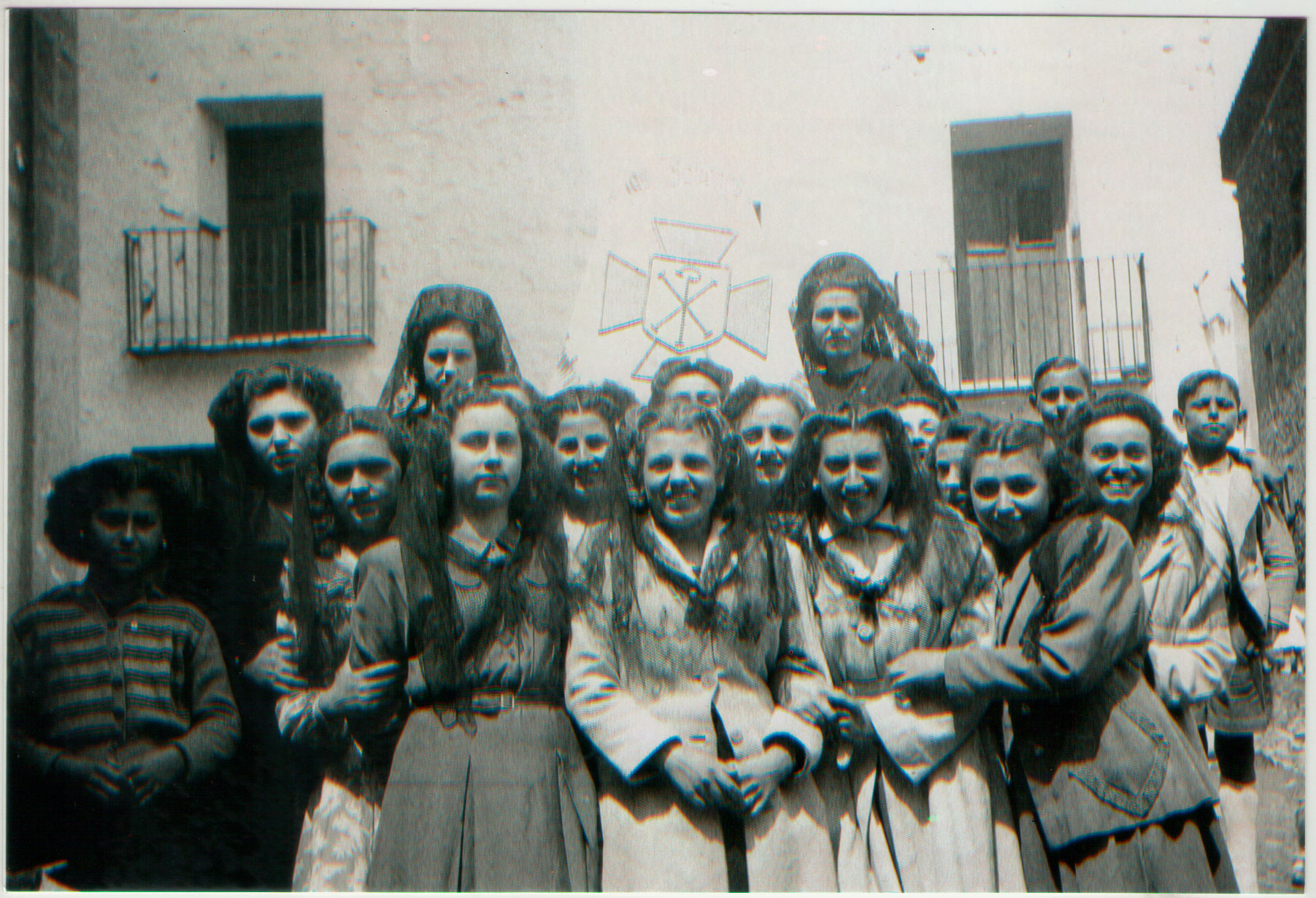 14- Més festes religioses: Joves d’Acció catòlica, cap a l’any 50 (esta foto també s’ha vist en diferents col·leccions). D’esquerra a dreta, Conxita Malaga, Trinidad de Baleso, Maria Valero, Sunción de Roqueta, Teresa Bolla, Lolín, Teresa Blasco, Carmen de Vedrí i Felicidad de Coloma. Sunción de Roqueta i Teresa Blasco, amb “teja” i “mantilla” que senyalen la seua jerarquia, sostenen la senyera d’Acció Catòlica. La resta de dones porten el cap cobert, com era habitual per a les dones que participaven en actes religiosos. Estan davant de l’església (que seria la façana de l’esquerra).