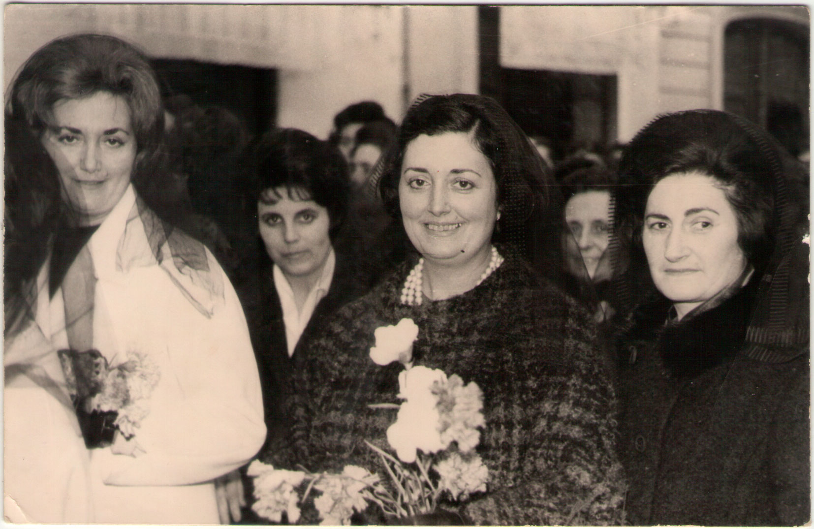 29- Les retratades són Angelines, Doloretes de Payasa, Paquita i Marí el Rico. Van a un acte religiós, com es pot deduir pels velets que porten sobre el cap. També van molt mudades, amb elegants abrics i, les dos de davant, amb ramells de flors.