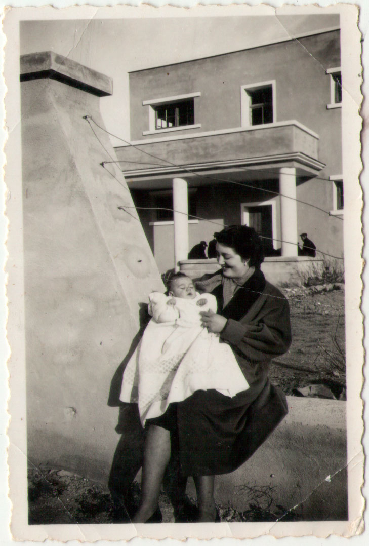 30- Paquita amb un dels seus fills davant del Grup Escolar, que pareix acabat de fer. Uns pocs homes prenen el solet a l’entrada de l’aulari, com si no hi hagueren reixes fora.