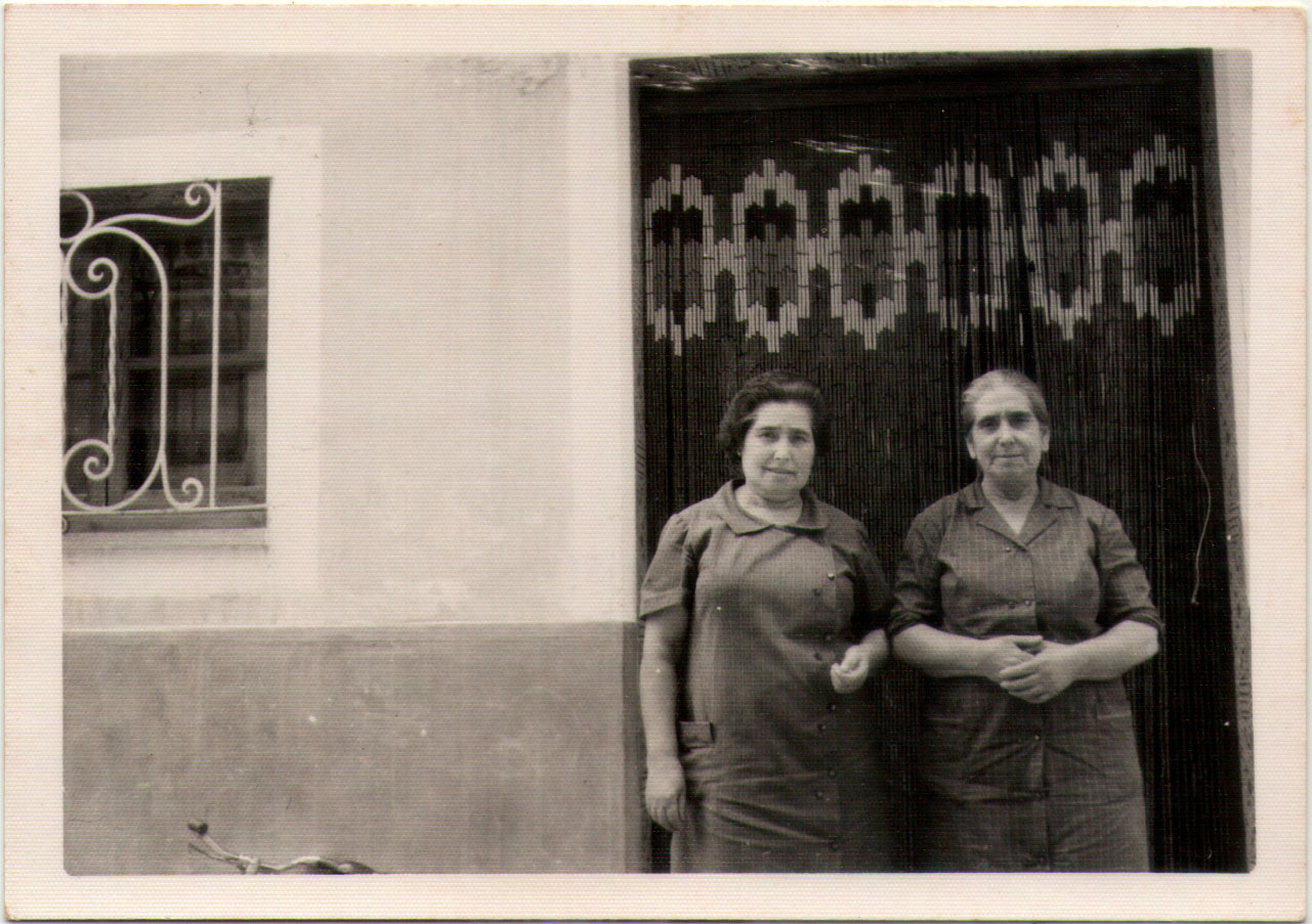 32- Les dos ties Carmen i Maria, una casada i l’altra fadrina, a la porta de casa. La nota simpàtica la posa la bicicleta de xiquet que tenen a l’esquerra. Un altra protagonista important és la gran cortina de canudets que tenen darrere. Este tipus de cortina, pesada i que feia un alegre sorollet quan entrava algú, ha desaparegut substituït pels materials sintètics. Fins als anys 70 era habitual que les famílies aprofitaren el temps en casa fent les tires de la cortina amb varilletes i canudets de fusta i altres materials que es venien a pes.
