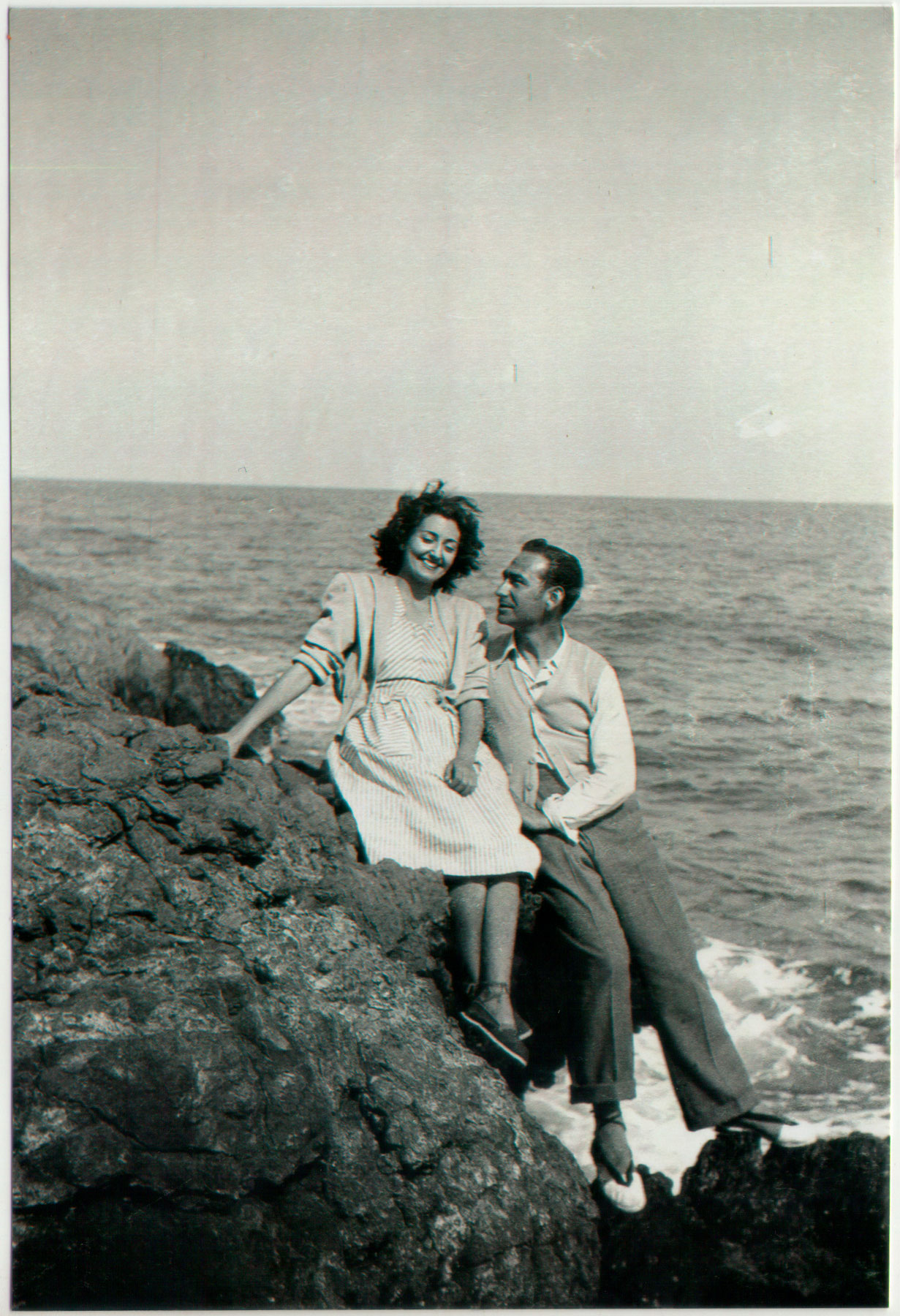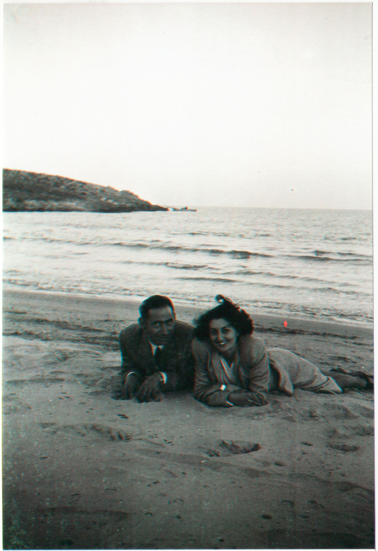 24- Una segona foto de parella en la platja, encara que no pareix precisament temps de prendre el bany, donada la roba d’abric que porten posada. No sabem amb quina finalitat es farien les fotos però pareix suficientment important com per a omplir-se d’arena i humitat. La mar està tranquil·la, la costa verge i al fons es veu una barqueta de pescadors fent la seua faena.