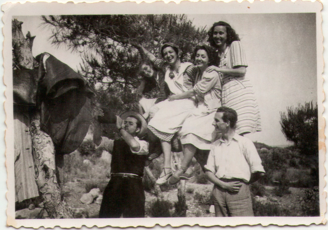 16- Una colleta de xiques del poble contra un alcornoc i amb el poble al fons. Són Maruja (dona de Benjamín de Cagarnera), Carmen de Vedrí, Lolín (filla de don Valeriano, el secretari), Rosario Bollo i, davant, Trinidad de Royo i Marí Primitiva. Hi ha molt poca brossa i els arbres estan molt esquilats, possiblement perquè actuaven els gavellers.